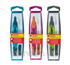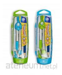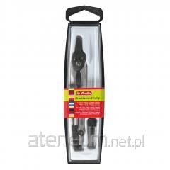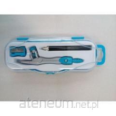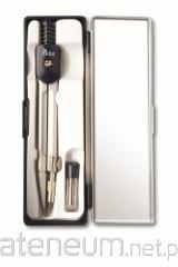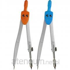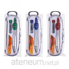 Cyrkiel szkolny, przeznaczony do kreślenia okręgów o średnicy do 340 mm. Wyposażony jest w grafit o średnicy 2 mm oraz zestaw zapasowych grafitów w plastikowym pojemniczku. Cyrkiel wykonany jest ze stopu cynku z wykończeniem imitującym nikiel. Plastikowy uchwyt cyrkla dostępny jest w kolorze czarnym, czerwonym, granatowym i pomarańczowym.
