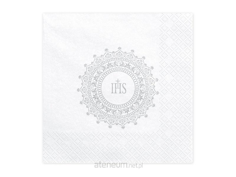 "Serwetki komunijne papierowe białe ze srebrnym nadrukiem IHS, wymiary po rozłożeniu ok. 33 x 33 cm, wymiary po złożeniu ok. 16,5 x 16,5 cm. (1 op. / 20 szt.)"