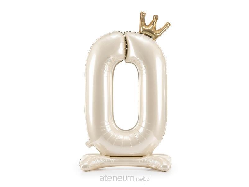 Stojący balon foliowy cyfra ''0'' w kolorze jasnokremowym z satynowym wykończeniem i koroną w kolorze złotym, rozmiar przed napompowaniem 103 cm (40.5''), rozmiar po napompowaniu 84 cm (33''). Do napompowania powietrzem. W zestawie dołączona jest słomka