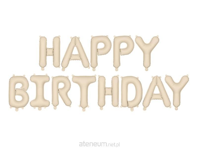 Balon foliowy matowy Happy Birthday w kolorze beżowym, wymiary ok. 340 x 35 cm (134 x 14''). Do napompowania tylko powietrzem. Każdy balon jest samouszczelniający się. Balony posiadają po 4 haczyki ułatwiające montaż napisu do wstążki.