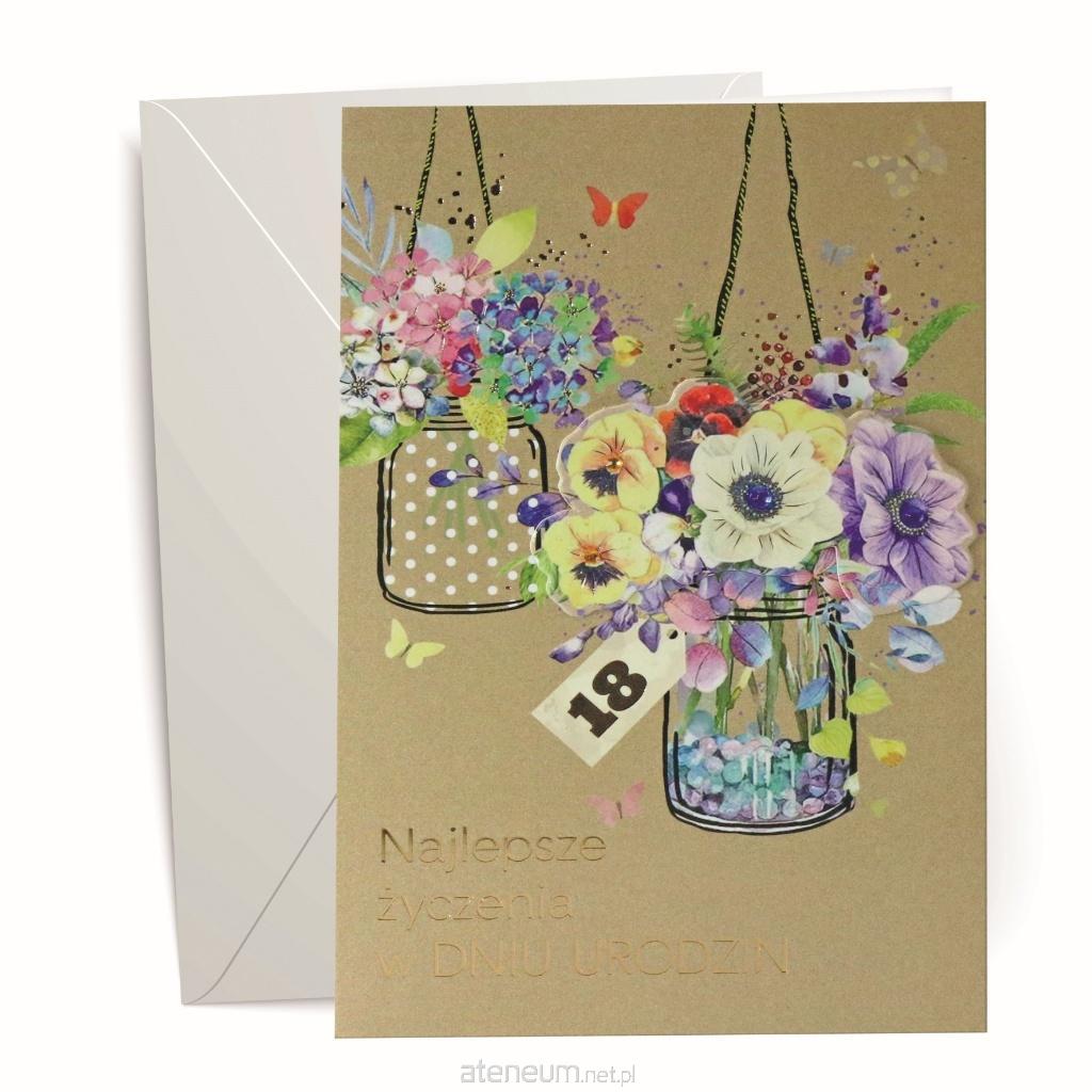 Kartka z kopertą, z życzeniami na 18 urodziny. Opakowana folią open.