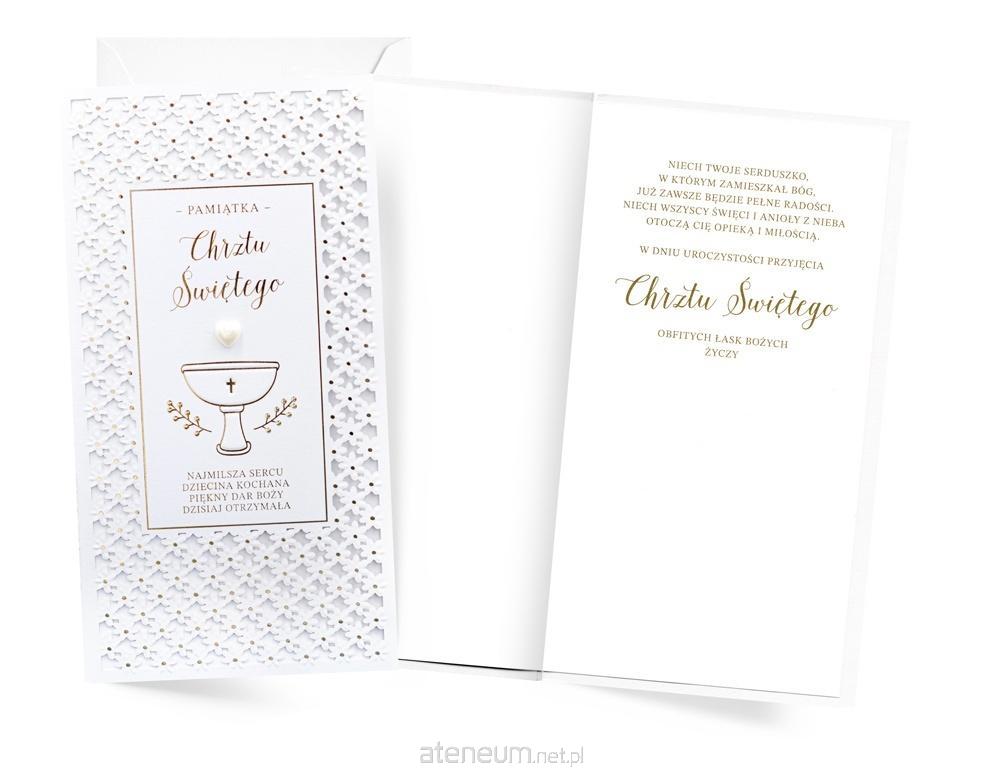 Kartka na Chrzest z serii Passion Moments PM-399 Każda kartka w kolekcji Passion Moments to małe arcydzieło - wyjątkowe i niepowtarzalne, piękne wizualnie. Kartki PM są bardzo bogato zdobione, a jednocześnie skromne i stylowe, cały efekt tkwi w detalach i doskonałym wykonaniu. W zależności od wzoru, na kartkach znajdują się dekoracje ze złotej, srebrnej, perłowej lub holograficznej folii, a także doklejki biżuteryjne, kokardki, laserowe wycięcia, wstążeczki i inne dodatki. Wnętrze karnetu to zawsze atrakcyjna grafika i tekst życzeń. Kartki mają w komplecie dopasowaną kopertę. Cechy szczególne: zdobienie: przynajmniej dwie folie (metaliczne/perłowe/holograficzne), elementy doklejane, wycięcia laserowe, wstążeczki - w zależności od wzoru, wnętrze: z delikatną grafiką, wyjątkowe życzenia w środku, w komplecie: dopasowana kolorystycznie koperta, wymiary karnetu po złożeniu: 11,4 x 21,5 cm. okazja: Chrzest