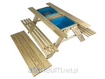 Drewniany zestaw ogrodowy zawierający stolik + 2 ławeczki. Zdejmowany częściowo blat w stoliku, dwie piaskownice (pojemniki) na piasek i wodę wewnątrz stołu. Dwa kg. atestowanego piasku gratis!