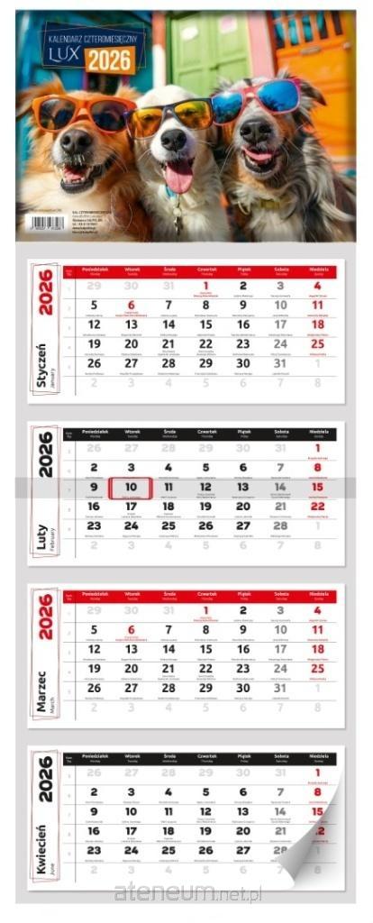 Kalendarz ścienny, czteromiesięczny z okienkiem; 12 kart. Główki wypukłe 2 wzory. Wymiary po rozłożeniu 295x800 mm.