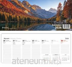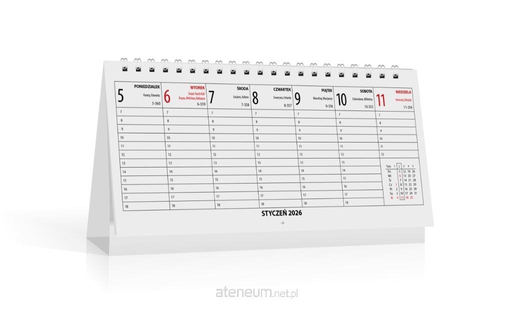 "Kalendarz biurkowy typu namiot, kalendarium w układzie miesięcznym, 54 strony + okładka. Na spirali, papier w środku kreda mat. Wymiary 250x110 mm"