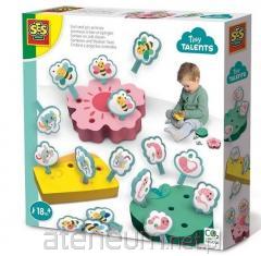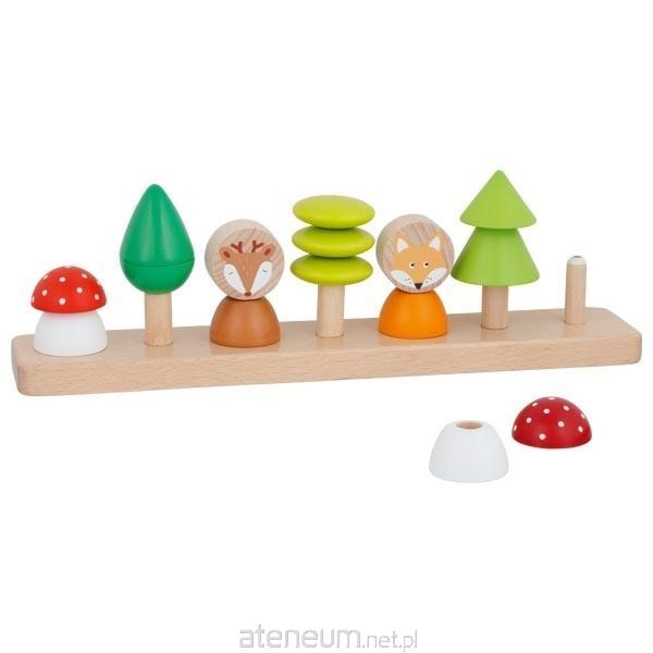 Drewniany zestaw z 16 elementami o różnych barwach i kształtach. Uczy rozpoznawania kolorów, kształtów i logicznego myślenia, rozwijając koordynację ręka-oko oraz zdolności manualne.