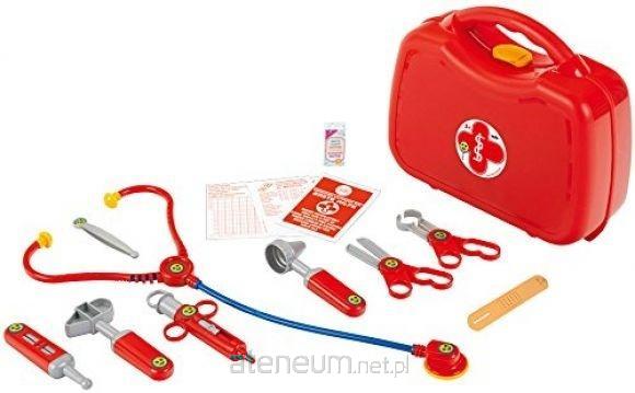 Zestaw w walizeczce zawiera podstawowe, niezbędne wyposażenie każdego medyka. Czerwona walizeczka wykonana jest z bardzo trwałego tworzywa, posiada wygodny uchwyt do noszenia oraz żółty klips, który zabezpiecza ją przed otwieraniem się. Ten niewielki zestaw zawiera aż 13 elementów. Wszystkie są oczywiście bezpieczne dla dzieci i proste w użyciu. W walizeczce znajdują się czerwono-granatowy plastikowy stetoskop, nożyczki plastikowe, szczypce, strzykawka, termometr, otoskop, młoteczek, pudełeczko na waciki, plaster, penseta i notatnik. Wszystkie elementy są oczywiście bezpieczne dla dzieci i proste w użyciu. Seria zestawów i akcesoriów lekarskich z jednej strony służy zabawie w doktora czy pielęgniarkę, a z drugiej strony pomaga dzieciom oswoić się z tematem wizyty u lekarza, wykonywanych badań i zabiegów. Mamy tutaj szeroki wybór zestawów z większą lub mniejszą ilością akcesoriów oraz szereg pojedynczych produktów jak np. fartuchy lekarskie czy stetoskopy. Cała seria wizualnie stworzona jest tak, aby mogli się nią bawić zarówno chłopcy jak i dziewczynki.