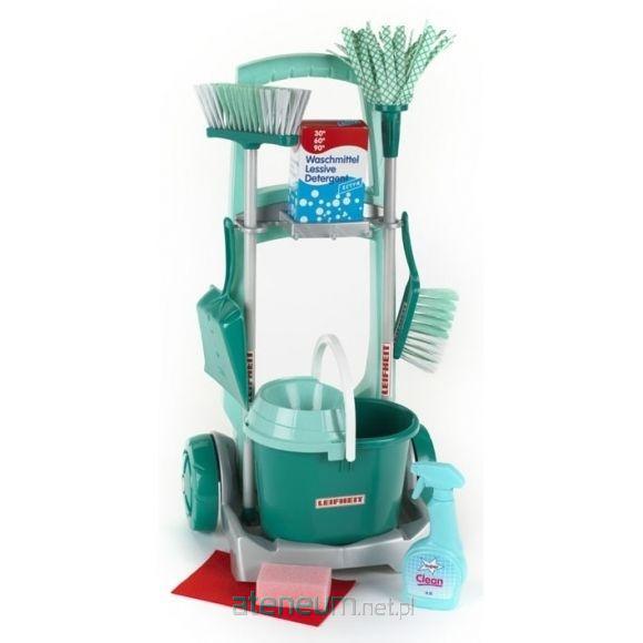 Zestaw wózka do sprzątania z akcesoriami na licencji Leifheit jest jednym z najbogatszych zestawów w tej serii. Oprócz standardowych akcesoriów do sprzątania, takich jak zmiotka z szufelką i miotła, zawiera także wyglądające zupełnie jak prawdziwe wiadro z wyciskaczem oraz mopa paskowego. Wszystkie te elementy mogą naprawdę zostać użyte do sprzątania. Główną atrakcją tego zestawu jest jednak wózek, który został zaprojektowany i wykonany tak, aby można było umieścić na nim wszystkie sprzęty. Dodatkowo wózek posiada specjalną półeczkę na dołączoną imitację detergentów, czy ściereczki. Dwa duże koła zamontowane po bokach oraz wygodny uchwyt, pozwalają szybko i sprawnie przemieścić się ze swoim warsztatem pracy w dowolne miejsce w domu. Do wiadra możemy nalać wody i zamoczyć w niej mopa, a następnie wycisnąć jej nadmiar za pomocą wyciskacza. Zabawka z pewnością spodoba się wszystkim dzieciom, które uwielbiają naśladować rodziców podczas wykonywania codziennych czynności, takich jak sprzątanie czy mycie podłóg. Dzięki solidnemu wykonaniu zabawka ta będzie służyć przez długi czas. Od prawdziwych akcesoriów odróżnia je tylko wielkość dostosowana dla dzieci. Bawiąc się w sprzątanie domu, dzieci zapoznają się z dorosłymi zadaniami, ćwiczą motorykę i rozwijają swoją wyobraźnię.