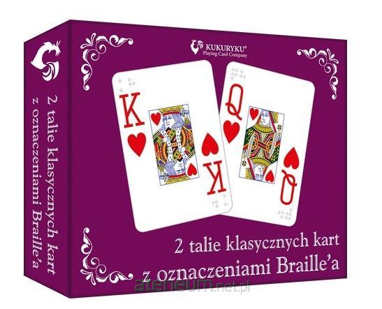 Zestaw zawiera dwie talie po 54 karty do gry z oznaczeniami Braille`a