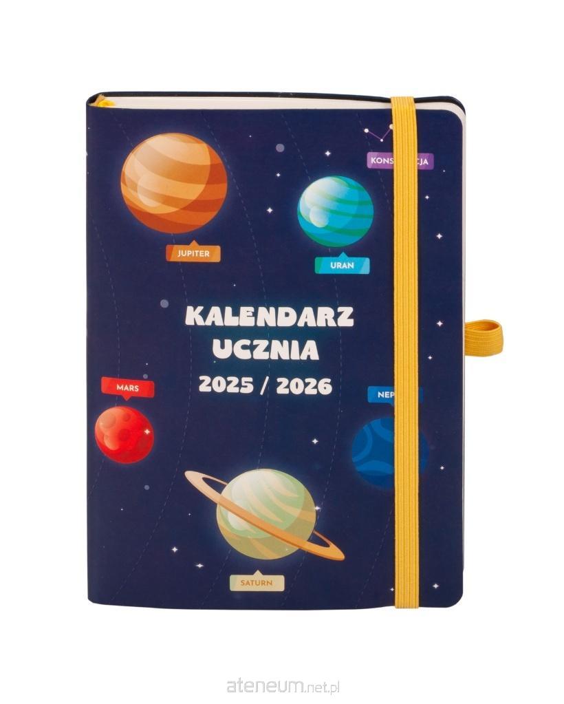 Wnętrze: tydzień na stronie Liczba stron: 180, Gramatura papieru: 80 g/cm2,Papier: chamois,Okładka: twarda, Pionowa gumka zamykająca,Zakres dat:wrzesień 2025 sierpień 2026, Dodatki szkolne:, Plan zajęć, Tabela ocen, Prace domowe, Sprawdziany, Zebrania z rodzicami,Wycieczki, Zajęcia pozalekcyjne, Wydatki, Lektury,Ważne wydarzenia oraz kolorowanki
