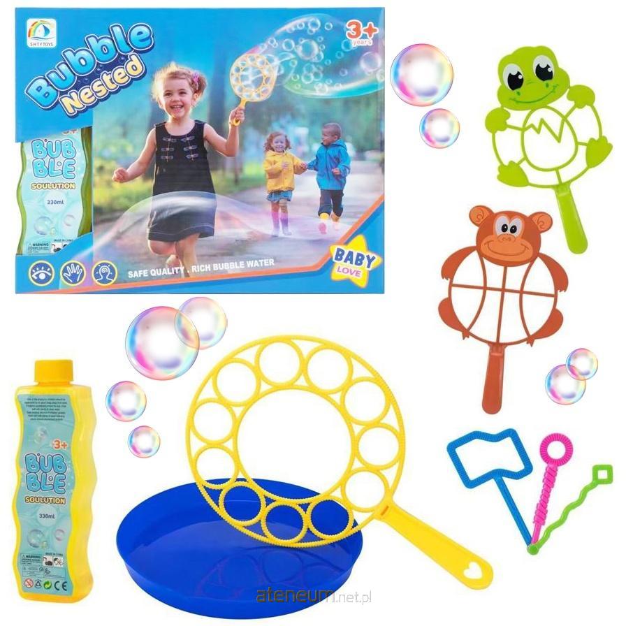 Zestaw do Puszczania Baniek Mydlanych - Duże Bańki i Akcesoria Stwórz magiczny świat pełen kolorowych baniek mydlanych z naszym fantastycznym zestawem! Ten komplet zapewni mnóstwo radości i wspaniałej zabawy na świeżym powietrzu dla dzieci w każdym wieku. Kluczowe cechy produktu: Różnorodne kształty do baniek: Zestaw zawiera kilka różnych kształtów do puszczania baniek, w tym dużą obręcz z wieloma otworami, które pozwalają na tworzenie wielu baniek jednocześnie, oraz mniejsze kształty w formie wesołych zwierzątek (żabka, małpka). Duża butelka płynu do baniek: W zestawie znajduje się duża butelka wysokiej jakości płynu do baniek mydlanych o pojemności 330 ml, co gwarantuje długą zabawę bez konieczności ciągłego uzupełniania. Łatwy w użyciu: Wystarczy zanurzyć wybrany kształt w płynie i poruszyć nim w powietrzu, aby cieszyć się pięknymi, tęczowymi bańkami. Bezpieczny i nietoksyczny: Płyn do baniek jest bezpieczny dla dzieci i posiada niezbędne atesty. Zabawa na świeżym powietrzu: Idealny do zabawy w ogrodzie, na plaży, podczas pikników i innych aktywności na świeżym powietrzu. Rozwija koordynację: Puszczanie baniek pomaga w rozwijaniu koordynacji wzrokowo-ruchowej i zachęca do aktywności fizycznej. Świetny pomysł na prezent: Ten zestaw to doskonały pomysł na prezent dla każdego dziecka, które uwielbia bańki mydlane. Zawartość zestawu: 1 x duża obręcz do puszczania wielu baniek 1 x kształt do baniek w formie żabki 1 x kształt do baniek w formie małpki 1 x mały kształt do pojedynczych baniek 1 x butelka płynu do baniek mydlanych (330 ml) 1 x niebieska miseczka na płyn Wielkość 28x22x5 cm Spraw, aby każdy dzień był pełen magicznych, tęczowych baniek z naszym kompletnym zestawem do puszczania baniek mydlanych!