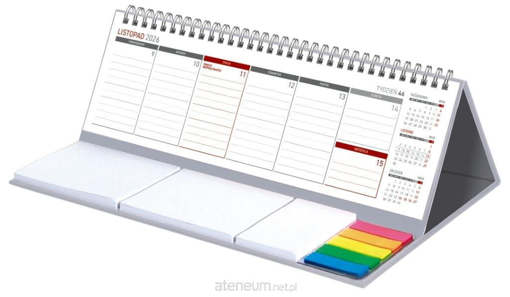 Wygodny kalendarz stojący na biurko z przejrzystym kalendarium w układzie tygodniowym z miejscem do notowania. Poręczne samoprzylepne karteczki. Kalendarium na spirali.