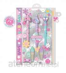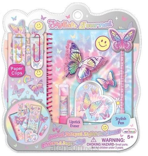Pamiętnik z ozdobami na spirali z kartkami w linie. W zestawie mały notesik-serduszko na dodatkowe zapiski, gumka do mazania w kształcie szminki, 2 duże ozdobne spinacze, arkusz naklejek, długopis z ozdobną końcówką. Wiek: 5+.