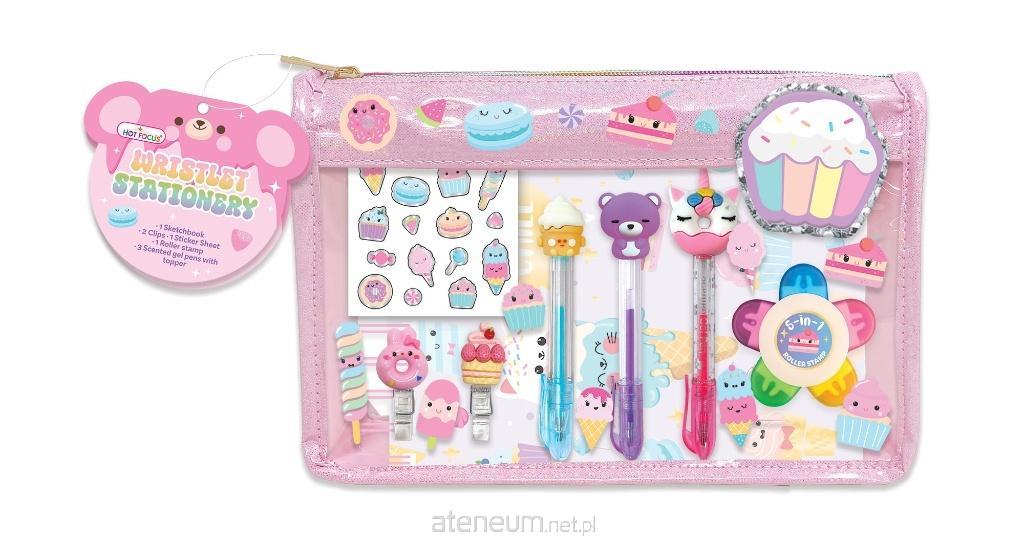 Zestaw zawiera: - kołozeszyt sketchbook - 3 długopisy żelowe z ozdobnymi nakładkami - arkusz naklejek - 2 klamerki z ozdobnymi nakładkami - pieczątki w rollerze w 5 kolorach i wzorach Zestaw zapakowany w ozdobną saszetkę zamykaną na zamek z uchwytem do wygodnego przenoszenia. Wiek: 5+