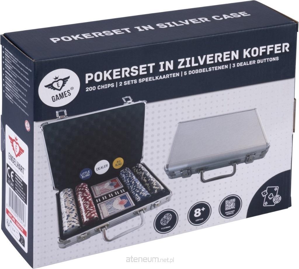Zestaw do gry w pokera składający się z 200 żetonów o masie 11,5 g, dwóch talii kart, aluminiowanej walizki, kości i dealer butonów
