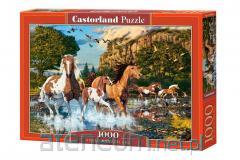 Puzzle Kapibara, składające się z 1000 elementów, przedstawiają zwierzątko na tle wodospadu. Po ich ułożeniu powstanie obrazek w rozmiarach 683x480 mm.