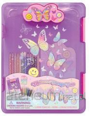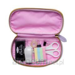 Zestaw przyborów zapakowany w kolorowy domek z drzwiczkami. Zestaw zawiera: - piórnik - saszetka - notesik - 2 pieczątki - 3 zakreślacze - 4 pisaki - dekoracyjna taśma klejąca z podajnikiem - arkusze naklejek