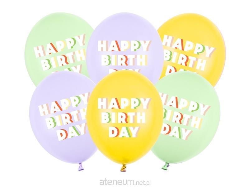 Balony Strong Happy Birthday z nadrukiem, zestaw zawiera 3 kolory balonów (Pastel Pistachio, Pastel Honey Yellow i Pastel Light Lilac) z dwustronnym nadrukiem, średnica ok. 30 cm.(1 op. / 6 szt.)