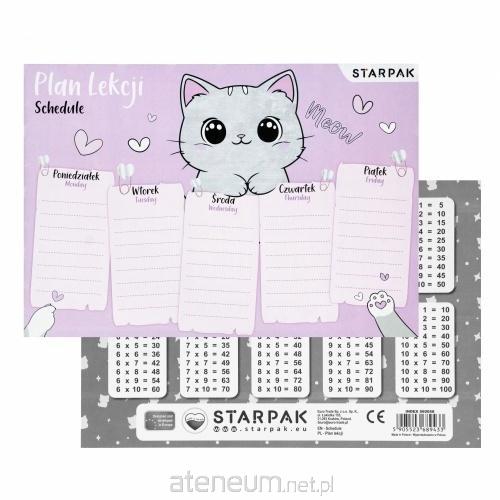 Plan lekcji jest niezbędnym elementem wyposażenia szkolnej wyprawki. Plan z kolekcji STARPAK Kitty zawiera podział na pięć dni tygodnia z 8 wierszami do wpisu, dzięki czemu żaden uczeń nie zapomni o potrzebnych mu danego dnia książkach czy zeszytach, dodatkowo na odwrotnej stronie posiada tabliczkę mnożenia.. Grafika z Kotkami sprawi, że każdy dzień w szkole będzie dobrze zaplanowany i udany. Zapoznaj się również z innymi produktami Starpak z serii Kitty! Plan lekcji wykonany z papieru. Wyprodukowany w Polsce. Pakowany w folię po 25 sztuk. Wymiary produktu (szer. x wys.) [cm]: 23x16. Waga produktu w opakowaniu [kg]: 0,24 kg.
