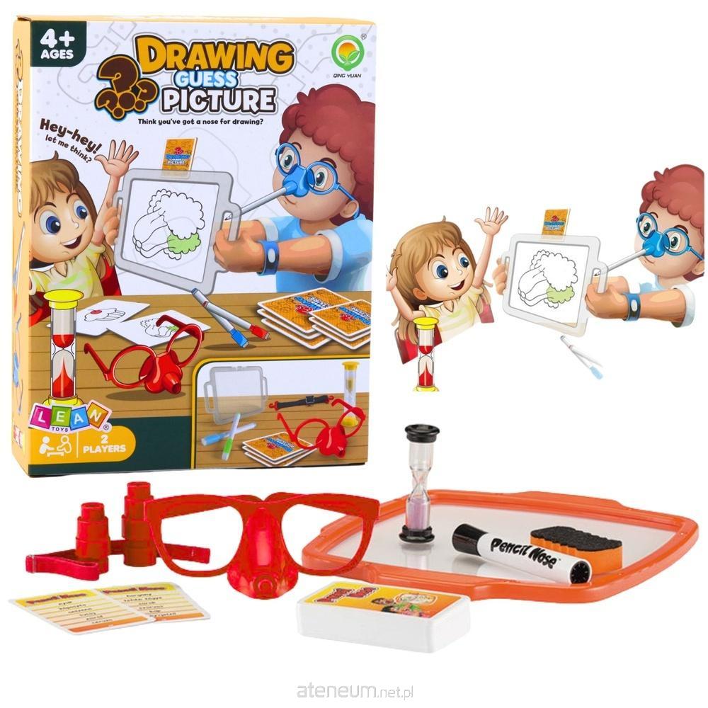 GRA NARYSUJ I ZGADNIJ OBRAZEK - MALOWANIE NOSEM Narysuj i Zgadnij Obrazek to przezabawna i kreatywna gra rodzinna, która pozwala graczom rysować nosem! Dzięki specjalnym okularom z uchwytem na marker, rysowanie staje się nie lada wyzwaniem i źródłem ogromnej dawki śmiechu. Gra łączy w sobie elementy kalamburów, rysowania i rywalizacji drużynowej - idealna na imprezy, spotkania rodzinne czy wspólną zabawę z dziećmi. Zadaniem gracza jest narysowanie hasła z karty przy pomocy specjalnych okularów - marker zamocowany w ramce służy jako "nos", którym malujemy na przezroczystej tablicy. Pozostali gracze muszą jak najszybciej odgadnąć, co przedstawia rysunek. Czas ogranicza klepsydra, więc liczy się refleks, wyobraźnia i współpraca. Gra została zaprojektowana z myślą o dzieciach od 4 roku życia, jednak bawi zarówno najmłodszych, jak i dorosłych. Zestaw zawiera 54 karty z hasłami i wszystkie akcesoria potrzebne do gry. Dodatkowym atutem jest możliwość tworzenia własnych haseł, dzięki czemu zabawa nigdy się nie nudzi! SPECYFIKACJA: Rodzaj gry: kreatywna gra drużynowa - rysowanie nosem Liczba graczy: 2 lub więcej (gra drużynowa) Tryb gry: na hasła z kart lub wymyślone przez graczy Czas jednej rundy: odliczany przez klepsydrę Cel gry: narysować obrazek nosem i odgadnąć jak najwięcej haseł Wymiary opakowania: 27 x 21 x 6,5 cm Materiał: tworzywo sztuczne, plastik, papier ZAWARTOŚĆ ZESTAWU: 2 x okulary z miejscem na marker 2 x marker (niebieski i zielony) z końcówką do ścierania 1 x przezroczysta tablica do rysowania 54 x karty z hasłami 1 x klepsydra 2 x opaski na rękę