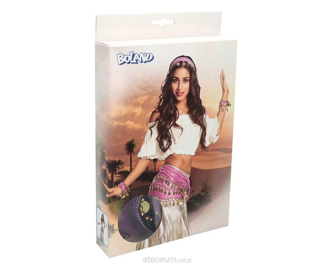 ZESTAW STRÓJ CYGANKI Rozmiar: uniwersalny Kolor: fioletowy, złoty Materiał: poliester Zestaw zawiera: opaska, bransoletki, pas Ilość sztuk w opakowaniu: 1 szt. (zestaw) Producent: Boland