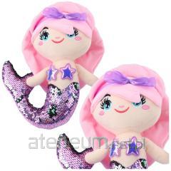 SPECYFIKACJA: Wymiary: 28 x 15 x 8 cm Materiał: miękki plusz, cekiny, tworzywo sztuczne Kolor ogona: jasnoróżowy z efektem zmiany z mieniących na matowe Kolor włosów: różowy Dodatki: kokardka, gwiazdki na tułowiu Przeznaczenie: do zabawy i przytulania ZAWARTOŚĆ ZESTAWU: Pluszowa syrenka z cekinowym ogonem