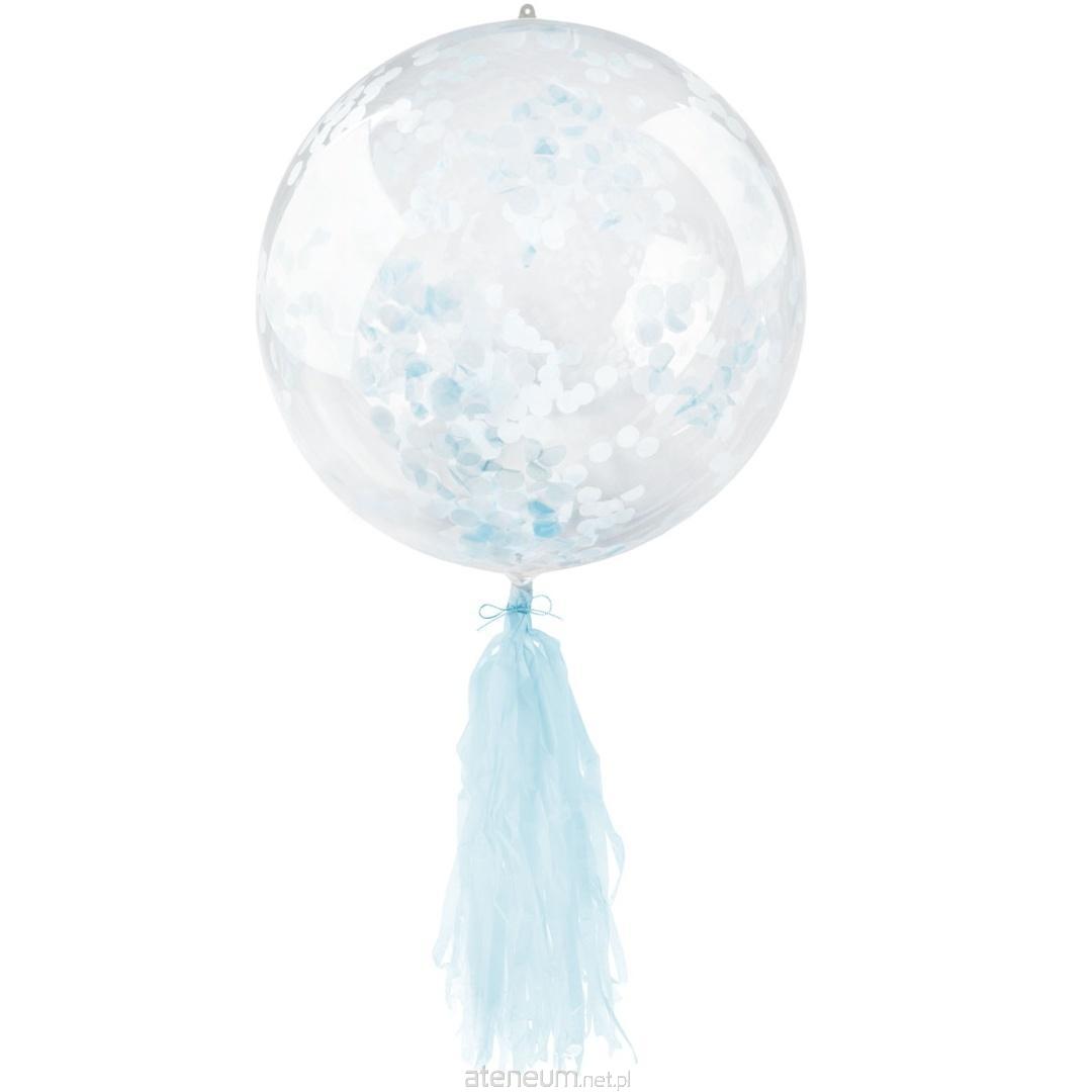 Zestaw dekoracyjny w kolorze niebieskim. W skład zestawu wchodzi transparentny balon pvc, papierowe niebieskie konfetti i frędzle. Duży balon wypełniony konfetti jest efektowną dekoracją przyjęcia. Wykończenie balonu lekkimi frędzelkami pięknie wygląda a pod wpływem podmuchu powietrza frędzelki delikatnie się ruszają. Balon można napełnić helem lub powietrzem. W przypadku wypełnienia powietrzem balon należy dmuchać pompką, na czubku balonu znajduje się małe oczko umożliwiające jego powieszenie. Dla uzyskania jak najlepszego efektu warto naelektryzować balon za pomocą suchej, miękkiej ściereczki, aby konfetti przyczepiło się do jego ścianek. Średnica balonu po napompowaniu to 45 cm. W opakowaniu znajduje się jeden komplet