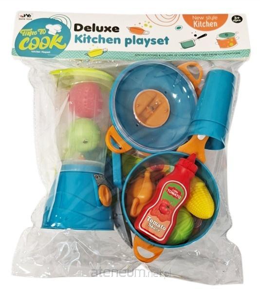 Zestaw kuchenny z garnkami, blenderem, kubkami, warzywami i owocami i akcesoriami. Zabawka przeznaczona dla dzieci od lat 3. Produkt zapakowany w przezroczysty worek.