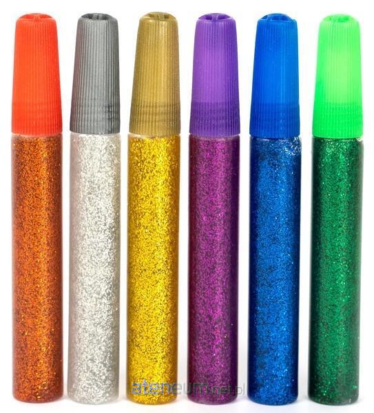 Bezbarwny klej dekoracyjny z brokatem w tubce, łatwy w użyciu, nie kruszy się i nie brudzi po wyschnięciu, przeznaczony do zdobienia papieru, tektury, drewna i innych powierzchni, 6 x 10 ml