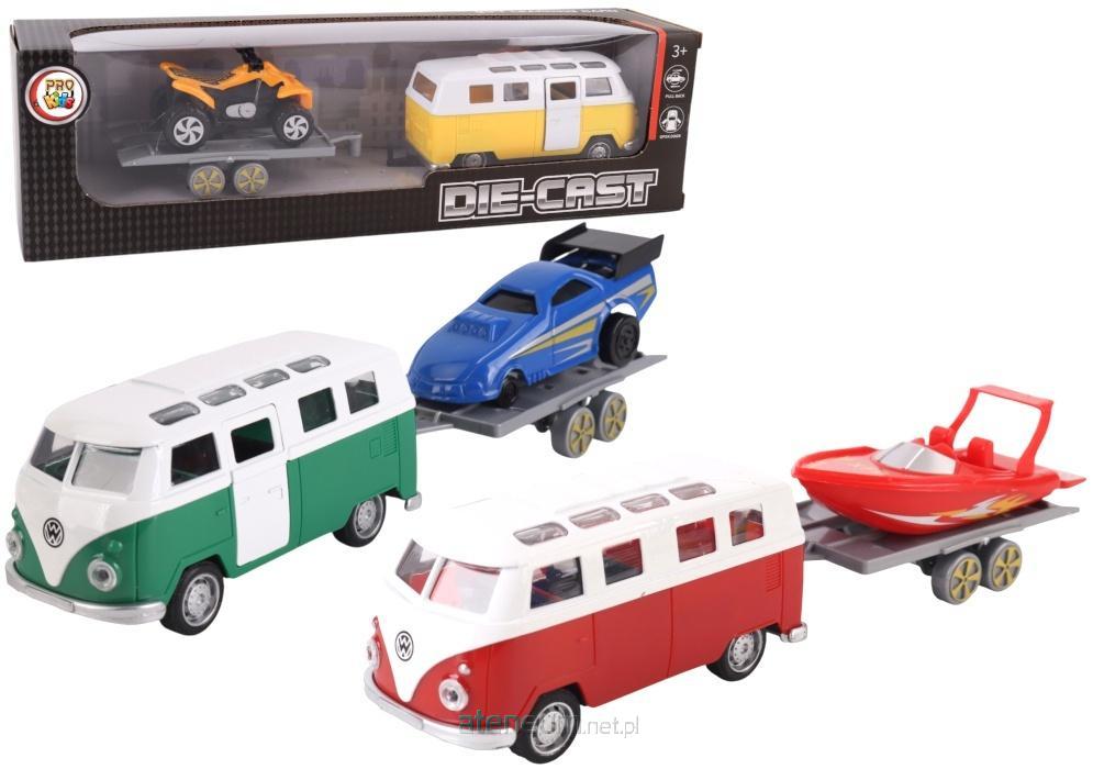 W zestawie: metalowy van + plastikowa przyczepa z pojazdem rekreacyjnym (sportowy samochód, motorówka lub quad asortyment)