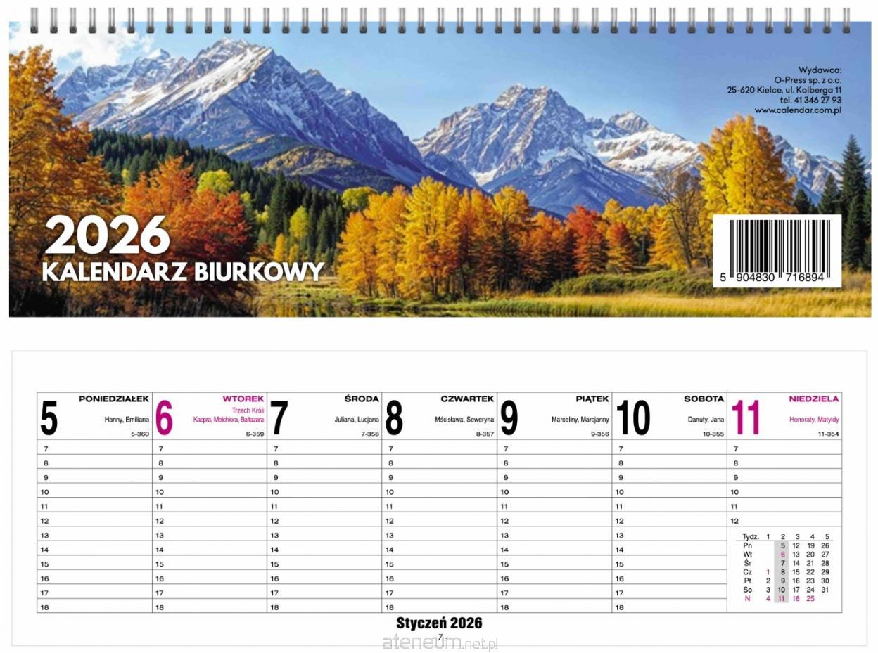 - Format 290 x 100 - Ilość stron: 56 - Oprawa: spirala - Układ kalendarium: 1 tydzień na stronie - Zawiera czytelne kalendarium z imieninami i Świętami w języku polskim - W dolnej części kalendarium przegląd aktualnego miesiąca Kalendarz Biurkowy poprzeczny to praktyczne i stylowe rozwiązanie zarówno do biura, jak i do domu. Dzięki kompaktowym wymiarom oraz przemyślanej konstrukcji doskonale komponuje się z każdą przestrzenią roboczą, dodając profesjonalnego charakteru Twojemu biurku. Wykonany z dbałością o detale, kalendarz posiada przejrzyste kalendarium, które ułatwia orientację w tygodniowych obowiązkach oraz planowanie z odpowiednim wyprzedzeniem. Spiralna oprawa nie tylko podkreśla elegancki wygląd, ale także zapewnia wygodę użytkowania - łatwe przewracanie stron oraz dostosowanie układu do własnych potrzeb. Każda strona oferuje dużą przestrzeń do notowania najważniejszych spotkań, zadań i przypomnień. Zaznaczone święta oraz daty imienin pomagają pamiętać o ważnych okazjach, a przegląd aktualnego miesiąca w dolnej części każdego tygodniowego rozkładu umożliwia szybkie zorientowanie się w planach na cały miesiąc. To doskonałe narzędzie do organizacji czasu dla osób ceniących funkcjonalność i estetykę w codziennej pracy.