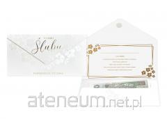 Po złożeniu format kartki DL, wyjątkowe złocenia, w środku życzenia i kieszonka na pieniądze. Dodatkowa koperta