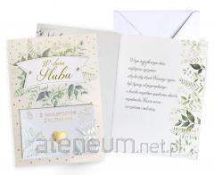 Po złożeniu format kartki DL, wyjątkowe złocenia, w środku życzenia i kieszonka na pieniądze. Dodatkowa koperta