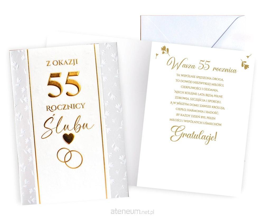 Kartka Dream Cards "Z okazji 55. rocznicy ślubu" DK-1344 Kartka B6 z ozdobnej serii Dream Cards - nieduża, ale robi wrażenie dzięki atrakcyjnej kolorystyce i ciekawym zdobieniom. To idealny wybór łączący przyjazną cenę z jakością. Cechy szczególne: wielkość: B6, 16.6 x 11.7 cm po złożeniu, koperta: w zestawie, kolorowa, zdobienia: kolorowe, różnorodne, bogate (w zależności od wzoru: przyklejane dekoracje, elementy biżuteryjne, odstawniki, metaliczne folie, tłoczenia itp.), okazja: Rocznica