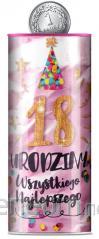 Skarbonka mała świnka SKM-010 "18, teraz mogę wszystko" Ceramiczna skarbonka w kształcie świnki to świetny pomysł na prezent. Świnki są kolorowe i ozdobione zabawnymi tekstami, świetnie się sprawdzą jako dekoracja pokoju. Cechy szczególne: Typ produktu: skarbonka na prezent, Materiał: ceramika Wys. świnki: 8,5 cm. Waga: 214 g Wymiary pudełka: 12,5 x 10 x 10 cm (dł x szer x wys) Opakowanie: kolorowy kartonik Okazja: osiemnastka
