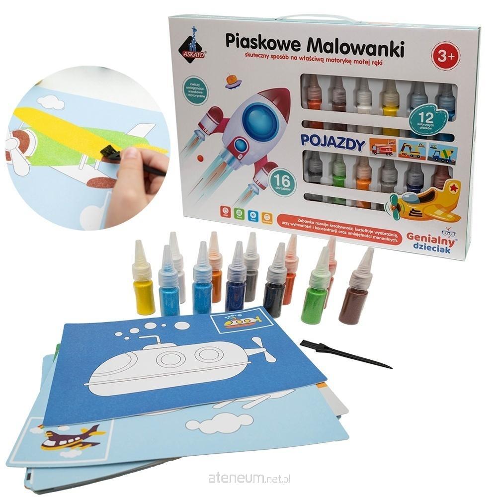 Piaskowa malowanka Pojazdy to zestaw, który zachwyci małych artystów i zapewni godziny twórczej, rozwijającej zabawy.