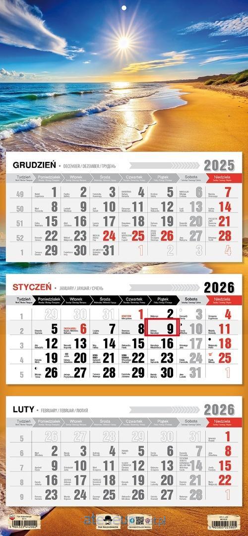 Kalendarz 2026 TRÓJDZIELNY PŁASKA GŁÓWKA. Format 315/680mm. Trzy komplety klasycznych kalendariów z przesuwnym okienkiem. Główka wypukła z otworem wierconym. Dodatkowo nazwy miesiąca i dni tygodnia w języku Ukraińskim, Angielskim i Niemieckim. Kalendarium dodatkowo zawiera fazy księżyca i znaki zodiaku. Dużo miejsca do notowania, czytelne duże litery i cyfry. Nowoczesne i klasyczne wzornictwo, dopracowane wzory, czytelne kalendarium. Praktyczny i elegancki kalendarz który sprawdzi się zarówno w domu, biurze jak i innych pomieszczeniach.