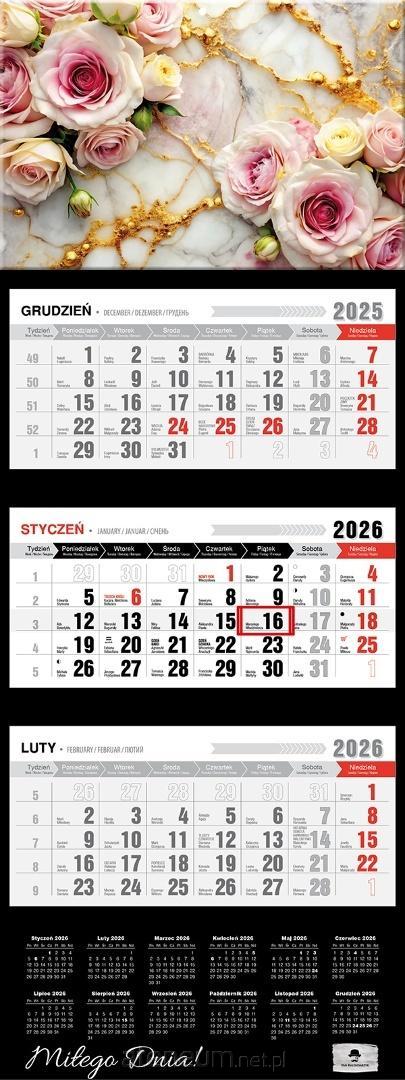 Kalendarz 2026 Trójdzielny PREMIUM Z WYPUKŁĄ GŁÓWKĄ. Format 315/810mm. Trzy komplety klasycznych kalendariów z przesuwnym okienkiem. Główka wypukła z otworem wierconym. Dodatkowo nazwy miesiąca i dni tygodnia w języku Ukraińskim, Angielskim i Niemieckim. Kalendarium dodatkowo zawiera fazy księżyca i znaki zodiaku. Dużo miejsca do notowania, czytelne duże litery i cyfry. DODATKOWO PRZEDŁUŻONE PLECKI KOLOREM DOPASOWANE DO WZORU ZE SKRÓCONYM KALENDARIUM NA ROK 2026. Nowoczesne i klasyczne wzornictwo, dopracowane wzory, czytelne kalendarium. Praktyczny i elegancki kalendarz który sprawdzi się zarówno w domu, biurze jak i innych pomieszczeniach.