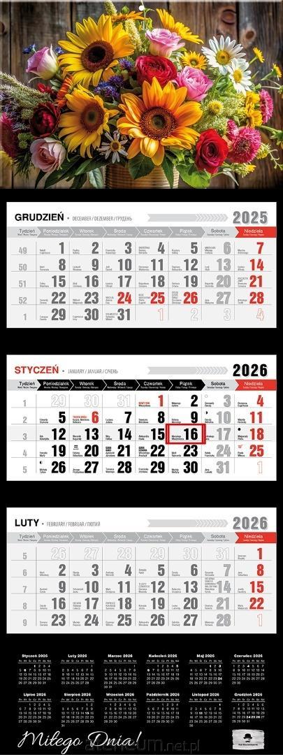 Kalendarz 2026 Trójdzielny PREMIUM Z WYPUKŁĄ GŁÓWKĄ. Format 315/810mm. Trzy komplety klasycznych kalendariów z przesuwnym okienkiem. Główka wypukła z otworem wierconym. Dodatkowo nazwy miesiąca i dni tygodnia w języku Ukraińskim, Angielskim i Niemieckim. Kalendarium dodatkowo zawiera fazy księżyca i znaki zodiaku. Dużo miejsca do notowania, czytelne duże litery i cyfry. DODATKOWO PRZEDŁUŻONE PLECKI KOLOREM DOPASOWANE DO WZORU ZE SKRÓCONYM KALENDARIUM NA ROK 2026. Nowoczesne i klasyczne wzornictwo, dopracowane wzory, czytelne kalendarium. Praktyczny i elegancki kalendarz który sprawdzi się zarówno w domu, biurze jak i innych pomieszczeniach.