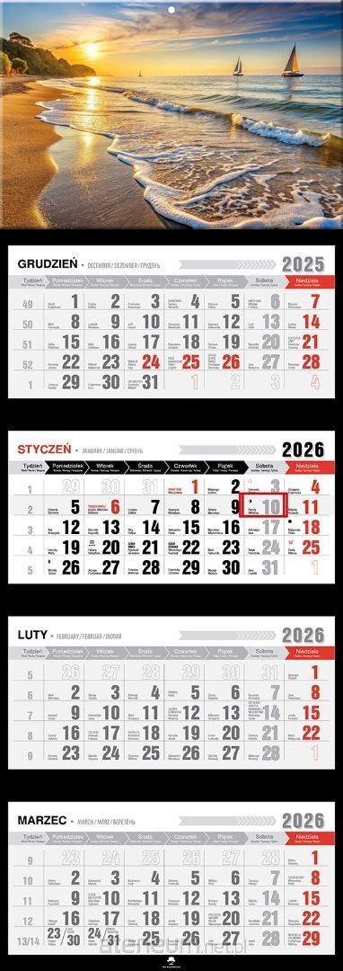 Kalendarz 2026 CZTERODZIELNY/ CZTEROMIESIĘCZNY /KWARTALNY PREMIUM Z WYPUKŁĄ GŁÓWKĄ. Format 315/890mm. Trzy komplety klasycznych kalendariów z przesuwnym okienkiem. Główka wypukła z otworem wierconym. Dodatkowo nazwy miesiąca i dni tygodnia w języku Ukraińskim, Angielskim i Niemieckim. Kalendarium dodatkowo zawiera fazy księżyca i znaki zodiaku. Dużo miejsca do notowania, czytelne duże litery i cyfry. Tematyka krajobrazy, pejzaże, zwierzęta, widoki, glamour, kawa. Nowoczesne i klasyczne wzornictwo, dopracowane wzory, czytelne kalendarium. Praktyczny i elegancki kalendarz który sprawdzi się zarówno w domu, biurze jak i innych pomieszczeniach.