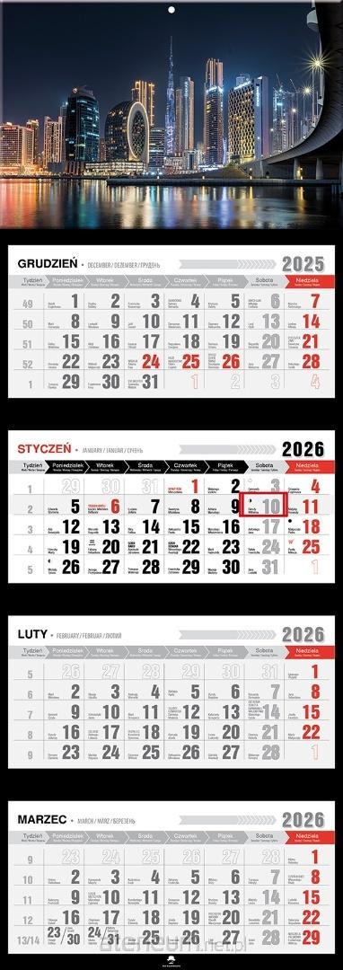 Kalendarz 2026 CZTERODZIELNY/ CZTEROMIESIĘCZNY /KWARTALNY PREMIUM Z WYPUKŁĄ GŁÓWKĄ. Format 315/890mm. Trzy komplety klasycznych kalendariów z przesuwnym okienkiem. Główka wypukła z otworem wierconym. Dodatkowo nazwy miesiąca i dni tygodnia w języku Ukraińskim, Angielskim i Niemieckim. Kalendarium dodatkowo zawiera fazy księżyca i znaki zodiaku. Dużo miejsca do notowania, czytelne duże litery i cyfry. Tematyka krajobrazy, pejzaże, zwierzęta, widoki, glamour, kawa. Nowoczesne i klasyczne wzornictwo, dopracowane wzory, czytelne kalendarium. Praktyczny i elegancki kalendarz który sprawdzi się zarówno w domu, biurze jak i innych pomieszczeniach.