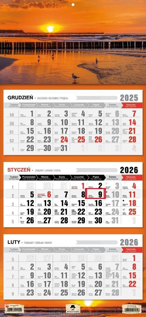Kalendarz Trójdzielny z płaską główką. Format 315/680mm. Trzy komplety klasycznych kalendariów z przesuwnym okienkiem. Główka z otworem wierconym. Dodatkowo nazwy miesiąca i dni tygodnia w języku Ukraińskim, Angielskim i Niemieckim. Kalendarium dodatkowo zawiera fazy księżyca i znaki zodiaku. Dużo miejsca do notowania, czytelne duże litery i cyfry.