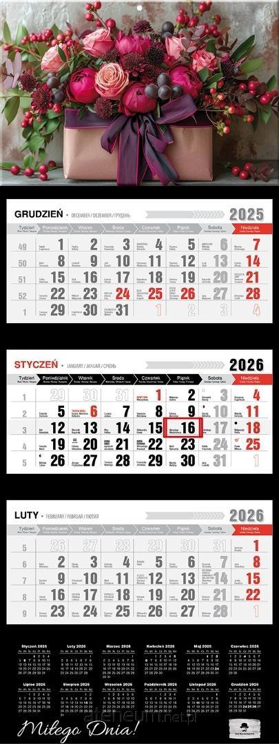 Kalendarz Trójdzielny PREMIUM Z WYPUKŁĄ GŁÓWKĄ. Format 315/810mm. Trzy komplety klasycznych kalendariów z przesuwnym okienkiem. Główka z otworem wierconym. Dodatkowo nazwy miesiąca i dni tygodnia w języku Ukraińskim, Angielskim i Niemieckim. Kalendarium dodatkowo zawiera fazy księżyca i znaki zodiaku. Dużo miejsca do notowania, czytelne duże litery i cyfry. DODATKOWO PRZEDŁUŻONE PLECKI KOLOREM DOPASOWANE DO WZORU ZE SKRÓCONYM KALENDARIUM NA ROK 2026.