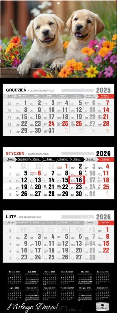 Kalendarz Trójdzielny PREMIUM Z WYPUKŁĄ GŁÓWKĄ. Format 315/810mm. Trzy komplety klasycznych kalendariów z przesuwnym okienkiem. Główka z otworem wierconym. Dodatkowo nazwy miesiąca i dni tygodnia w języku Ukraińskim, Angielskim i Niemieckim. Kalendarium dodatkowo zawiera fazy księżyca i znaki zodiaku. Dużo miejsca do notowania, czytelne duże litery i cyfry. DODATKOWO PRZEDŁUŻONE PLECKI KOLOREM DOPASOWANE DO WZORU ZE SKRÓCONYM KALENDARIUM NA ROK 2026.