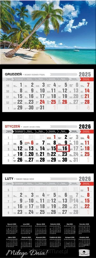 Kalendarz Trójdzielny PREMIUM Z WYPUKŁĄ GŁÓWKĄ. Format 315/810mm. Trzy komplety klasycznych kalendariów z przesuwnym okienkiem. Główka z otworem wierconym. Dodatkowo nazwy miesiąca i dni tygodnia w języku Ukraińskim, Angielskim i Niemieckim. Kalendarium dodatkowo zawiera fazy księżyca i znaki zodiaku. Dużo miejsca do notowania, czytelne duże litery i cyfry. DODATKOWO PRZEDŁUŻONE PLECKI KOLOREM DOPASOWANE DO WZORU ZE SKRÓCONYM KALENDARIUM NA ROK 2026.