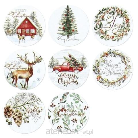 Naklejki papierowe na taśmie O25mm 8 wzorów Boże Narodzenie choinka, wianki, górska chata, pick-up z choinkami, renifer 500szt.