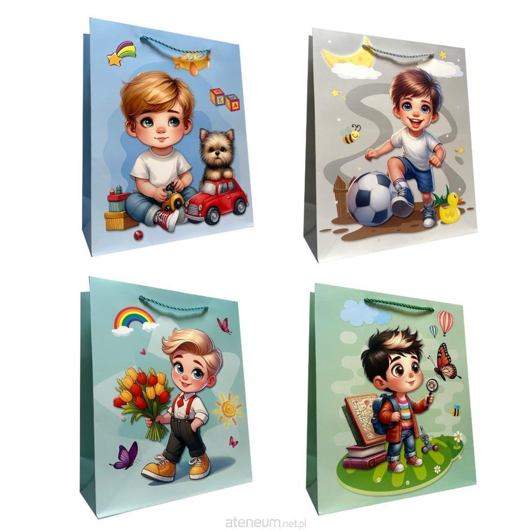 Torebka papierowa dziecięca, dla chłopca wykonana z grubszego papieru o gramaturze 210 g, co zapewnia jej większą trwałość i odporność na obciążenie. Wyposażona w grubszy, kolorowy sznurek, który zapewnia wygodny uchwyt i estetyczne wykończenie. To praktyczne opakowanie, które podkreśla wartość wręczanego prezentu.
