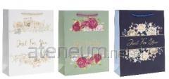Elegancka papierowa torebka prezentowa z subtelnym, metalizowanym wzorem dekoracyjnym wykonana z grubszego papieru o gramaturze 210 g, co zapewnia jej większą trwałość i odporność na obciążenie. Wyposażona w elegancką tasiemkę, który zapewnia wygodny uchwyt i estetyczne wykończenie. To praktyczne opakowanie, które podkreśla wartość wręczanego prezentu.