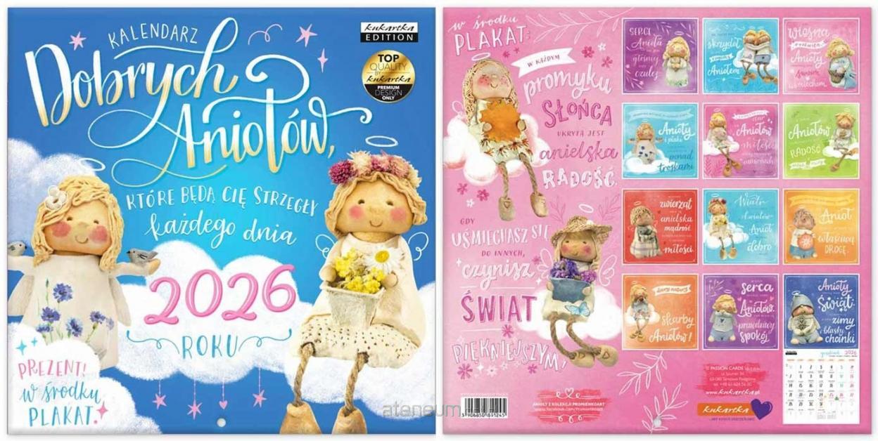 Kalendarz 2026 Dobre Anioły Kwadratowy kalendarz ścienny na rok 2026 z aniołami. Każdy miesiąc cieszy pięknym zdjęciem anioła, który będzie wspaniałą ozdobą Waszego domu. Kalendarz po rozłożeniu ma wymiary 30x60 cm - górny kwadrat wypełnia zdjęcie, a dolny kalendarium. PREZENT: W środku kalendarza znajdziecie plakat o wielkości 30x 60 cm Specyfikacja: Wielkość: 30 x 30 cm (po rozłożeniu 30 x 60 cm) Gratis: plakat Styl: cytaty, nowoczesny, klasyczny, zdjęciowy