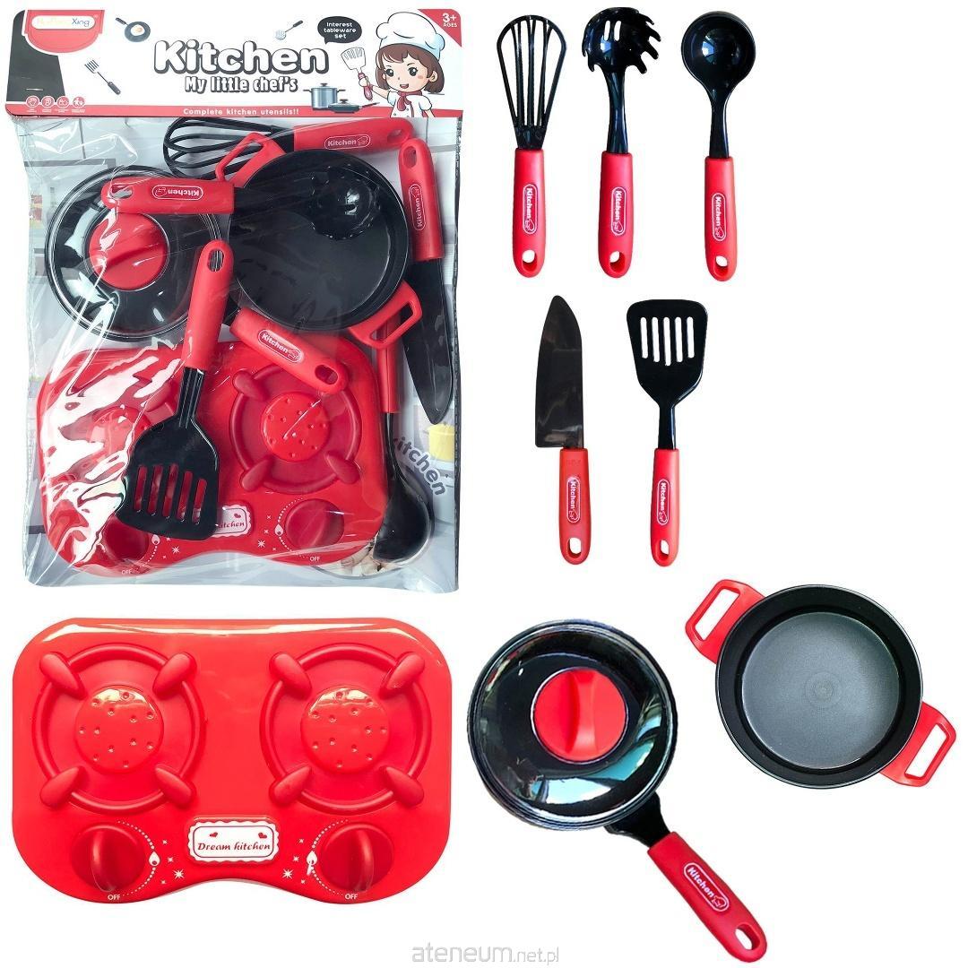 Kompleksowy zestaw kuchenny: Zawiera wszystko, czego potrzebuje mały kucharz: dwupalnikową kuchenkę, patelnię z pokrywką, garnek, oraz zestaw narzędzi kuchennych.